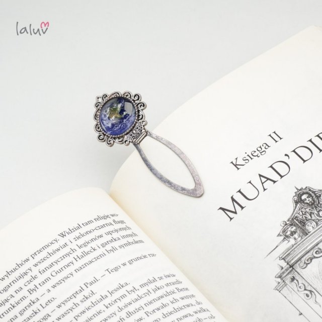 Ręcznie robiona zakładka do książki z wysokiej jakości grafiką zamkniętą pod wypukłym szkiełkiem i oprawioną w bazę w kolorze srebrnym.