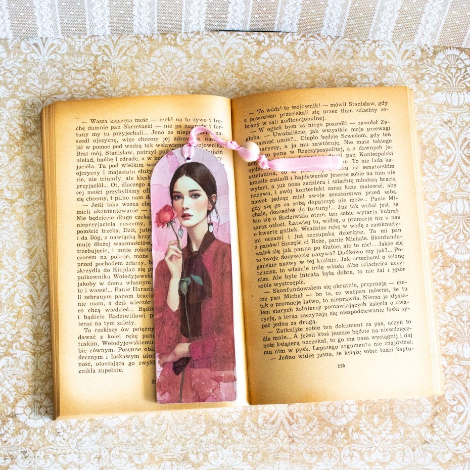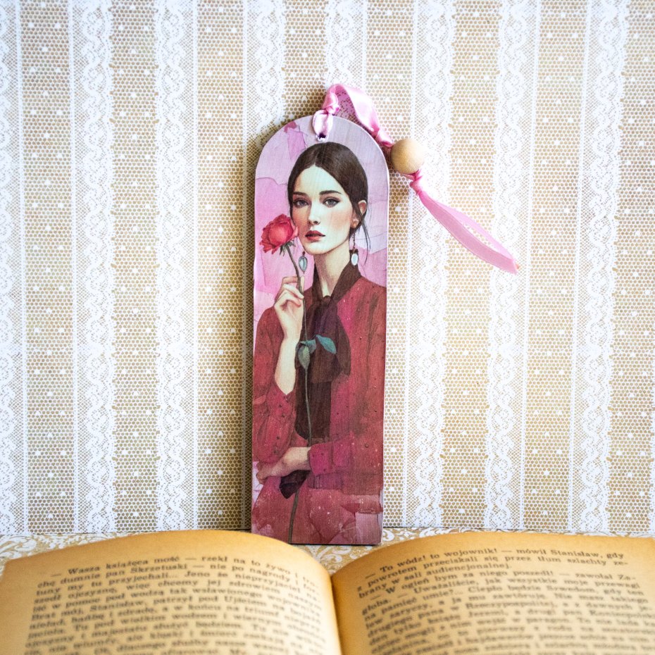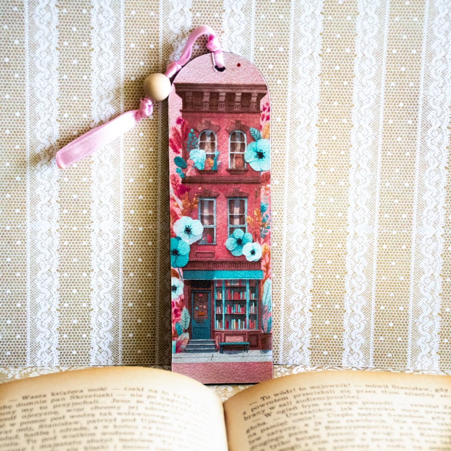 Zakładka ma też wstążeczkę i drewniany koralik