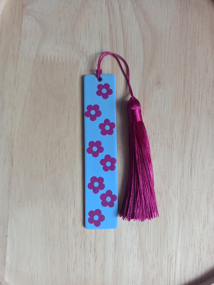 Zakładka do książki wykonana z wysokiej jakości gliny polimerowej w kolorze jasnego kobaltu (blekitnym) z kwiatkami w kolorze fuksji.