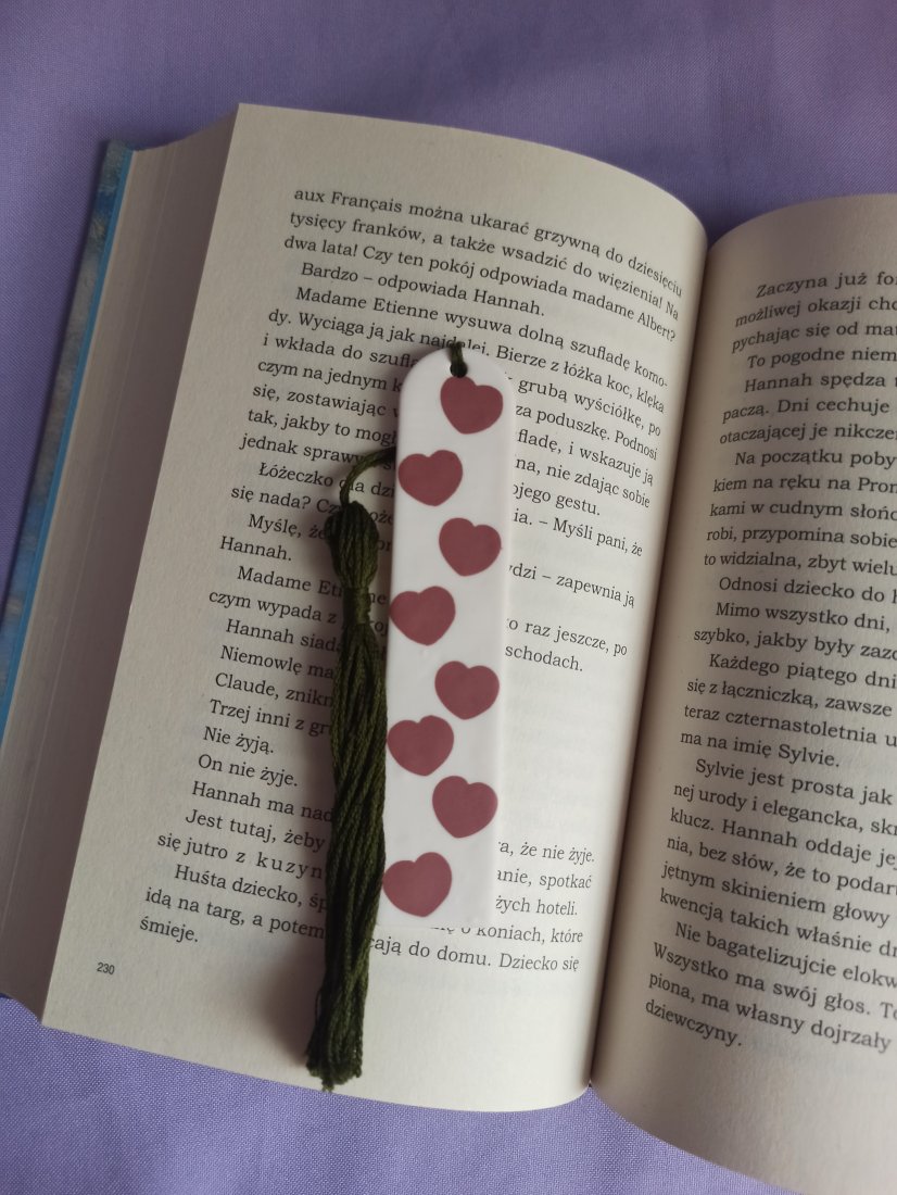 Zakładka do książki wykonana z wysokiej jakości gliny polimerowej w kolorze białym z serduszkami w kolorze brudnego różu.