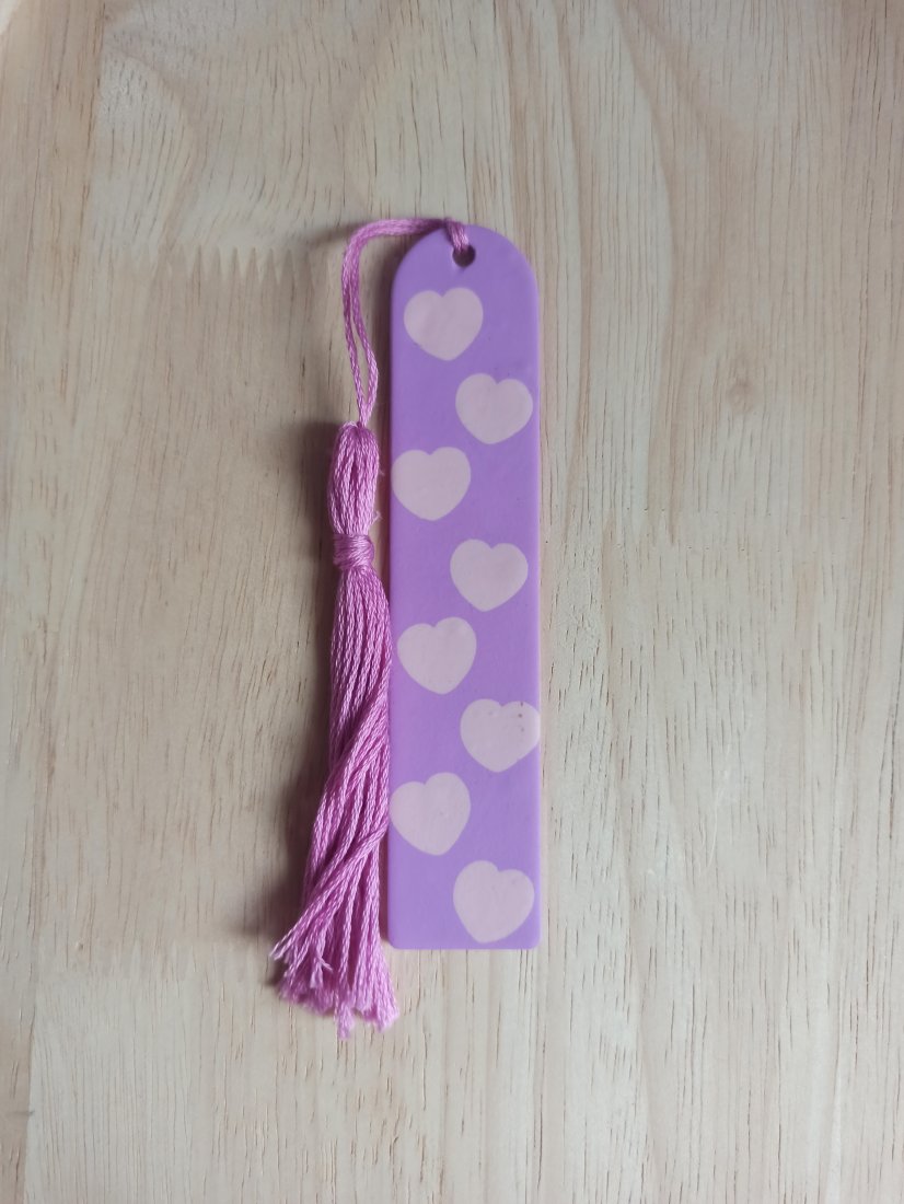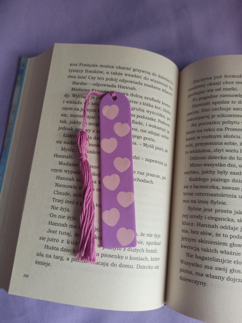 Zakładka do książki wykonana z wysokiej jakości gliny polimerowej w kolorze jasnego fioletu (lawendy)z serduszkami w kolorze różowym.