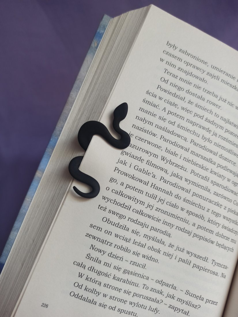 Zakładka do książki w kształcie węża wykonana z wysokiej jakości gliny polimerowej w kolorze czarnym.