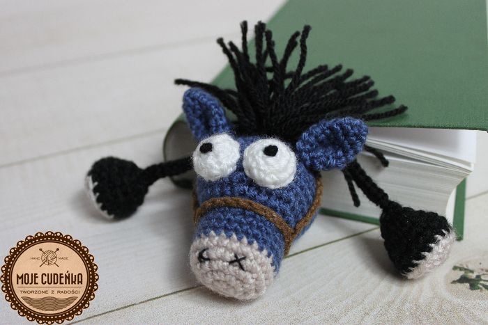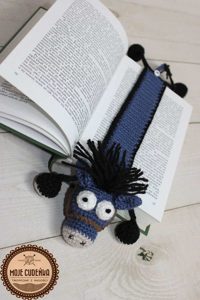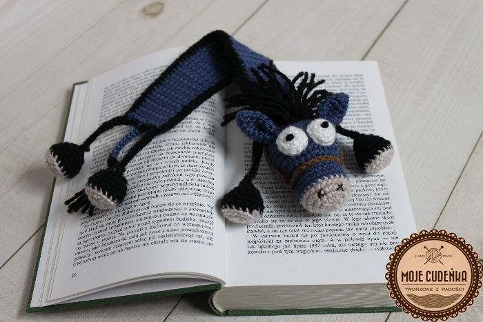 Zakładka wykonana szydełkiem z miękkiej akrylowej włóczki w kształcie osiołka. Długość ok 34 cm. Idealny pomysł na prezent.