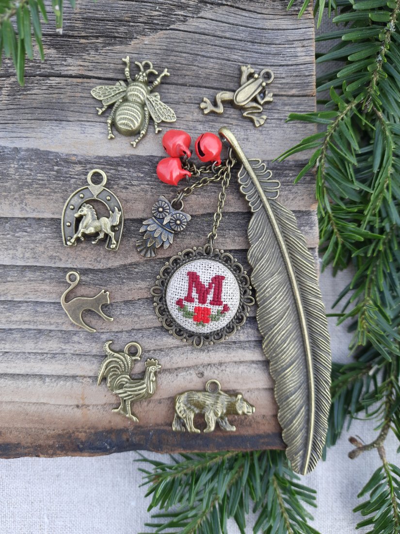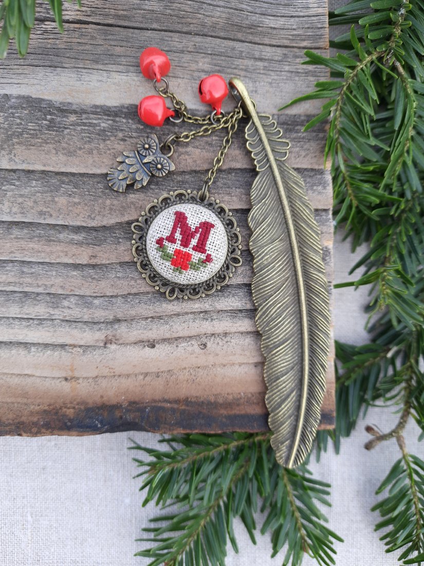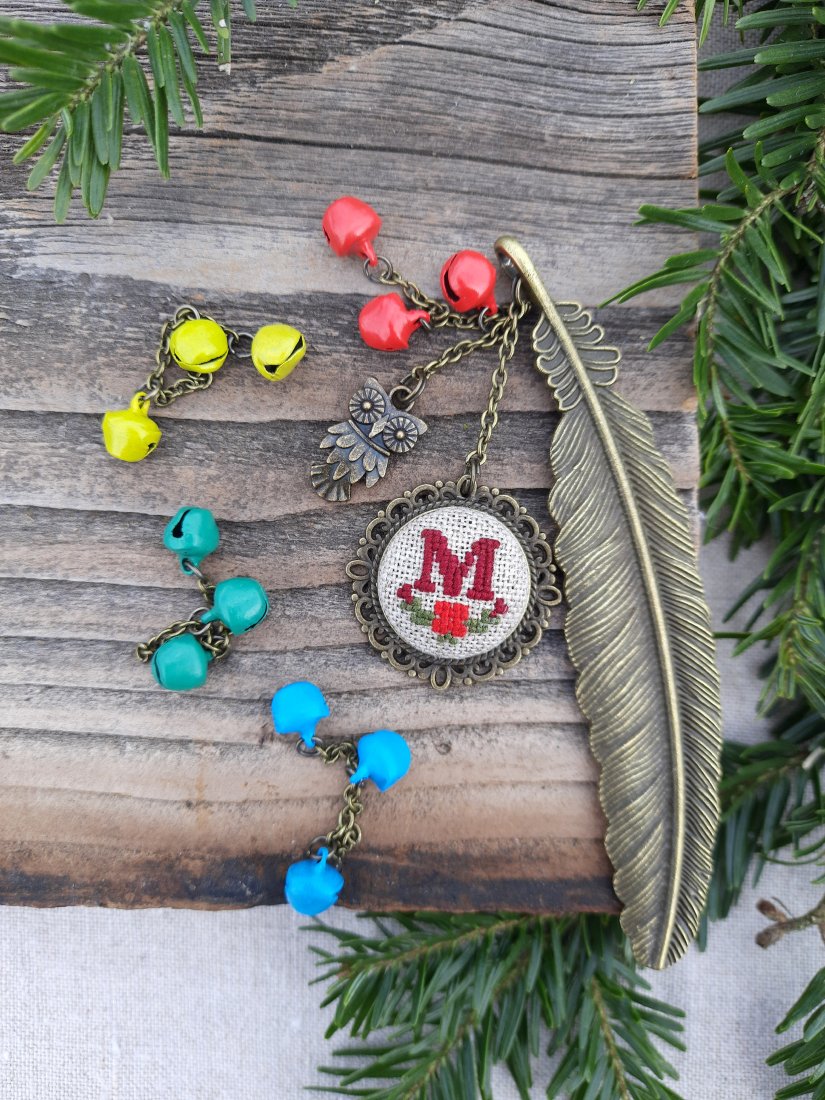 Metalowa zakładka w kształcie pióra z ręcznie wyhaftowaną literą. Po zakupie proszę o wiadomość jaka litera ma znaleźć się na zakładce, jaki kolor dzwonków (czerwony, zielony, niebieski czy żółty) oraz jaka przywieszka (sowa, niedźwiedź, kogut, kot, koń, pszczoła czy żaba).