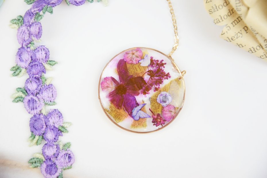 Lekki, metalowy łańcuszek wieńczy żywiczna zawieszka – niczym zamrożony w czasie mikroświat – kryjący suszone kwiaty, uchwycone w pełnym rozkwicie i zatrzymane w krysztale żywicy.