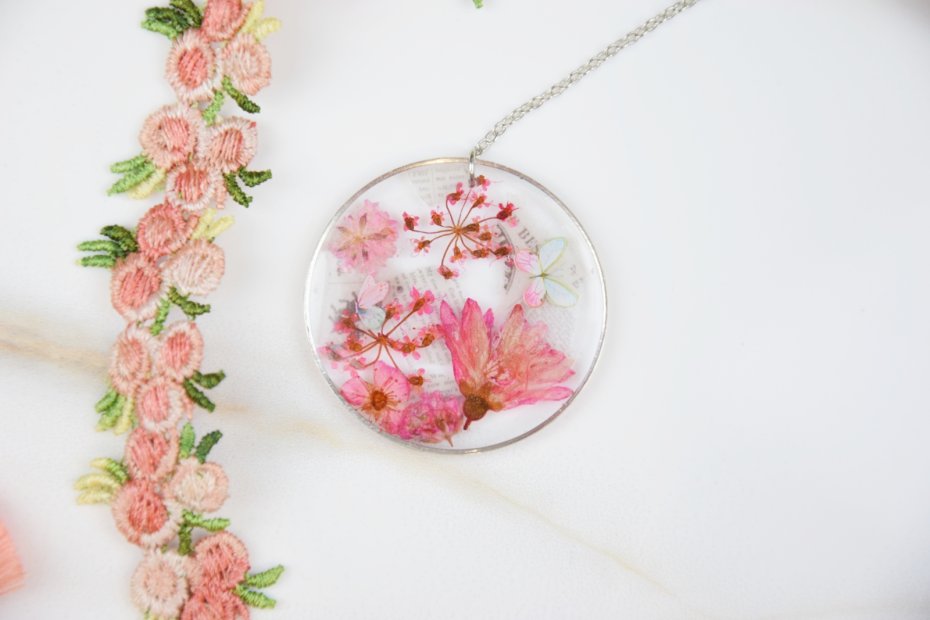 Lekki, metalowy łańcuszek wieńczy żywiczna zawieszka – niczym zamrożony w czasie mikroświat – kryjący suszone kwiaty, uchwycone w pełnym rozkwicie i zatrzymane w krysztale żywicy.