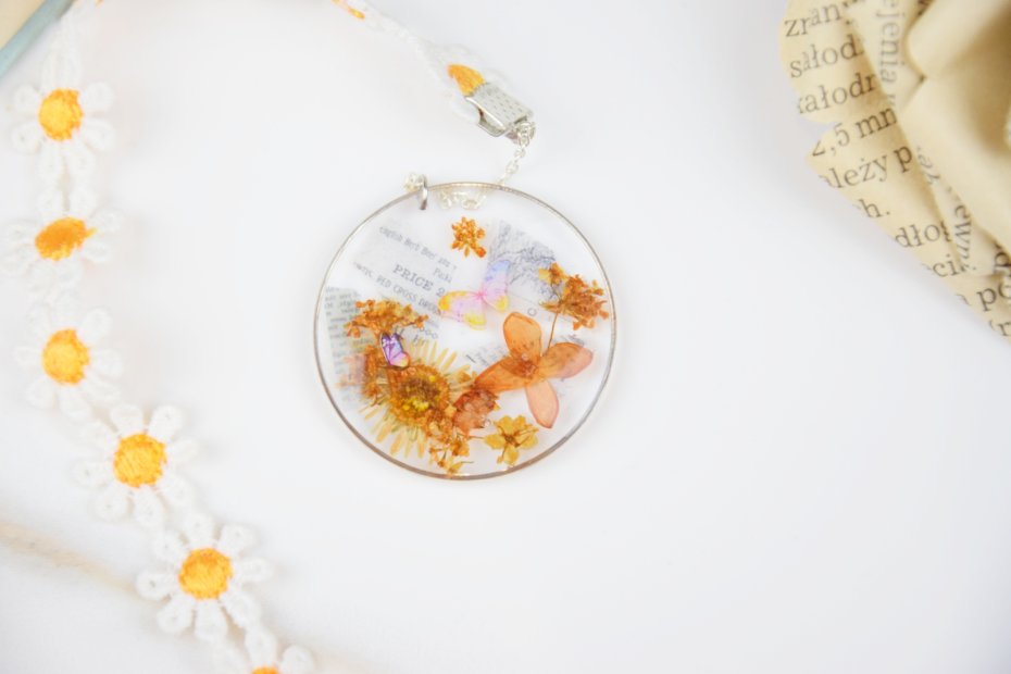 Lekki, metalowy łańcuszek wieńczy żywiczna zawieszka – niczym zamrożony w czasie mikroświat – kryjący suszone kwiaty, uchwycone w pełnym rozkwicie i zatrzymane w krysztale żywicy.