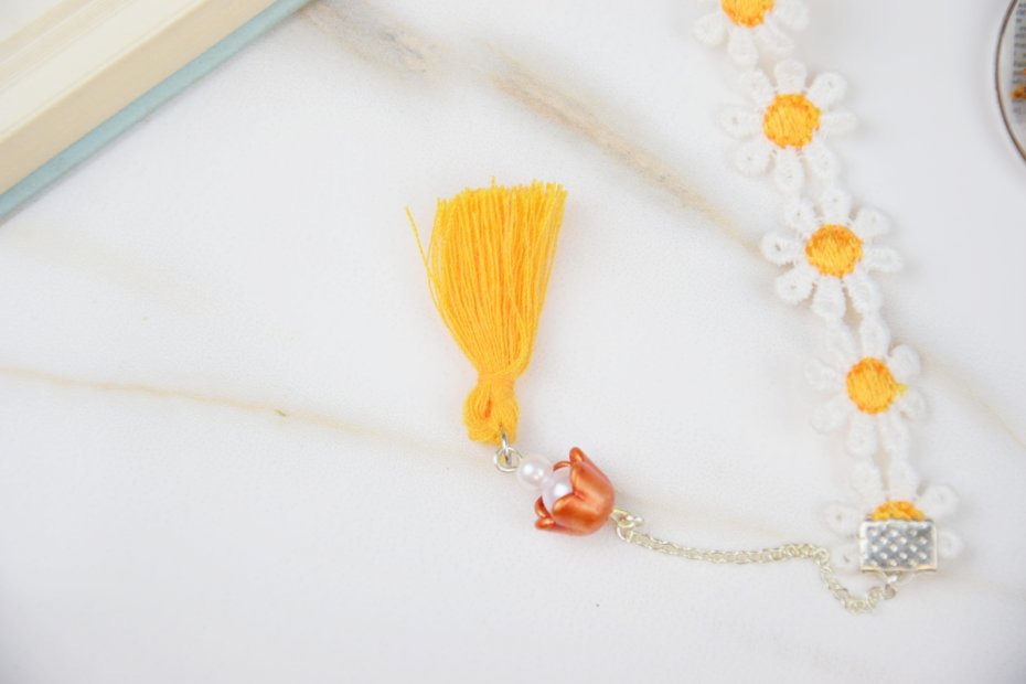Na drugim końcu łańcuszka odnajdziesz chwost otulony kwiatem – subtelny akcent, który przy każdym ruchu opowiada własną historię ciszy, światła i wiatru. To zakładka stworzona dla tych, którzy potrafią dostrzec poezję w liściu, magię w płatku i harmonię w detalu.