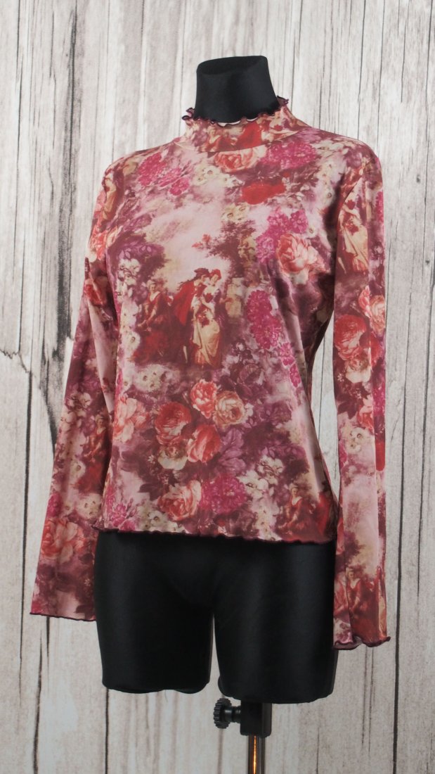 Piękna nylonowa bluzka z barokowymi zalotnikami i motywem kwiatowym.