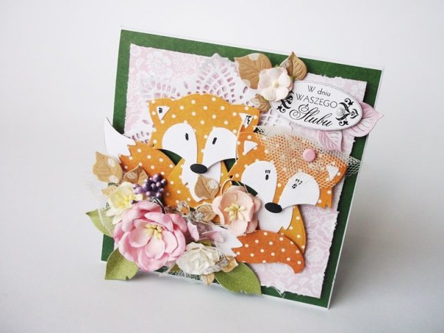 Zabawna kartka na ślub z młodą parą Lisów. Pani Lisowa ze stylową woalką, Pan Lis wręcza jej bukiet kwiatów. Zakochani!