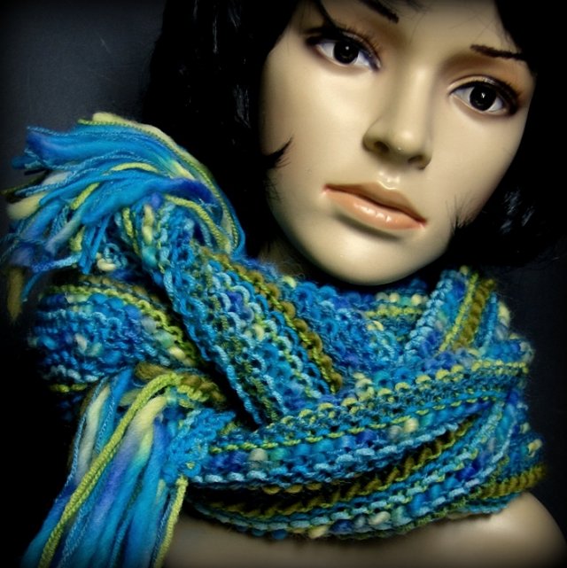 Niepowtarzalny długi szal , wykonany ręcznie na drutach z różnych włóczek w soczystych odcieniach turkusu, jeansu i pistacji. Ciepły i dobrze się układa. Niestety zdjęcia nie oddają pięknych niuansów kolorystycznych. Wymiary: ok. 218 z frędzlami x 21 cm. Skład: głównie wełna, moher, akryl. Polecam serdecznie. Pojedynczy egzemplarz. Ładniejszy, niż na zdjęciach...