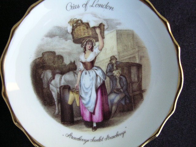 Porcelitowy talerzyk w pełni użytkowy i wielce ozdobny..Sygnowany TUSCAN Fine English Bone China Made in England. Z kolekcjonerskiej serii z zakrzyknieniami sprzedawców na ulicach dawnego Londynu. Tutaj - truskawki. Delikatna ,stonowana kolorystyka malatury i charakterystyczne napisy. Ciepła biel porcelany i delikatnie ryflowane i bogato zdobione ranty. Kształt półgłęboki. góra 11,5 dół 6 x 2