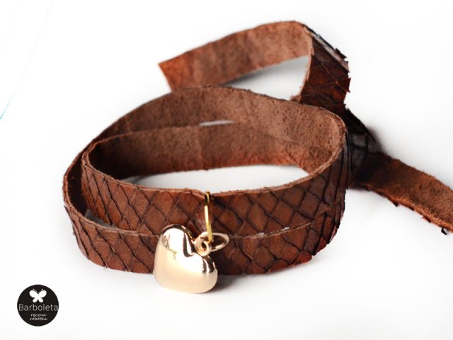 Bransoletka typu zamotka wykonana z naturalnej mięciutkiej, skóry w odcieniu brązu, skóra w stylu vintage, z zawieszką serduszkiem.