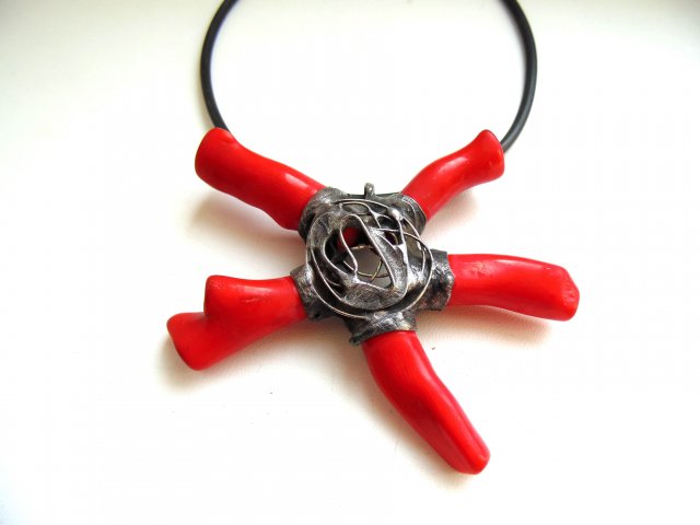 Wisiorek wykonany techniką witrażową z koralowców. Rozpiętość płatków max 8 cm. Zawieszony na czarnej lince kauczukowej o długości ok. 45 cm.