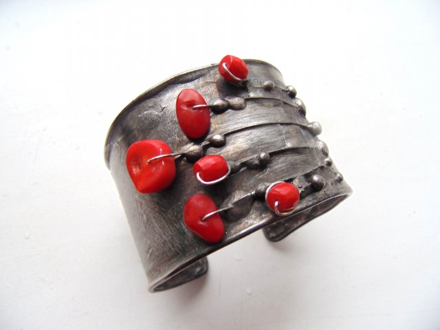 Bransoletka wykonana z miedzi, cyny i koralowców. Szerokość ok. 4 cm. Obwód regulowany.