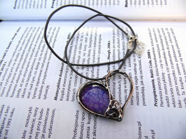Wisiorek wykonany z miedzi, cyny i agatu. Wisi na szarym rzemieniu o długości ok. 45 cm. Wymiary ok. 4,5 na 4 cm.