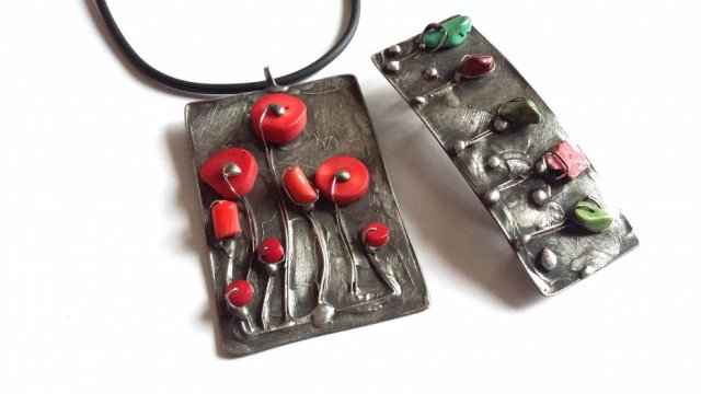 Wisiorek wykonany z miedzi, cyny i koralowców. Zawieszony na czarnej lince kauczukowej o długości ok. 45 cm. Wymiary ok. 7,5 na 5 cm.