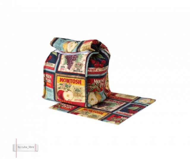 Wierzchnia tkanina to bawełna z motywem etykiet owocowych. Podszewka jest bawełniana w kolorze granatowym. W środku dodatkowo posiada warstwę termoizolacyjną - trzymającą temperaturę. Dno posiada dodatkowe usztywnienie. Krawędzie przeszyte, żeby torba lepiej trzymała kształt. Zamykana na rzepy.