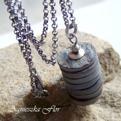 Biżuteria wykonana na zamówienie. Wisior z plastrami muszli szarej 15mm, oprawiony w srebro pr. 925. Długość wisiora 3cm. Długi łańcuch 60cm. Całość oksydowana i wypolerowana.