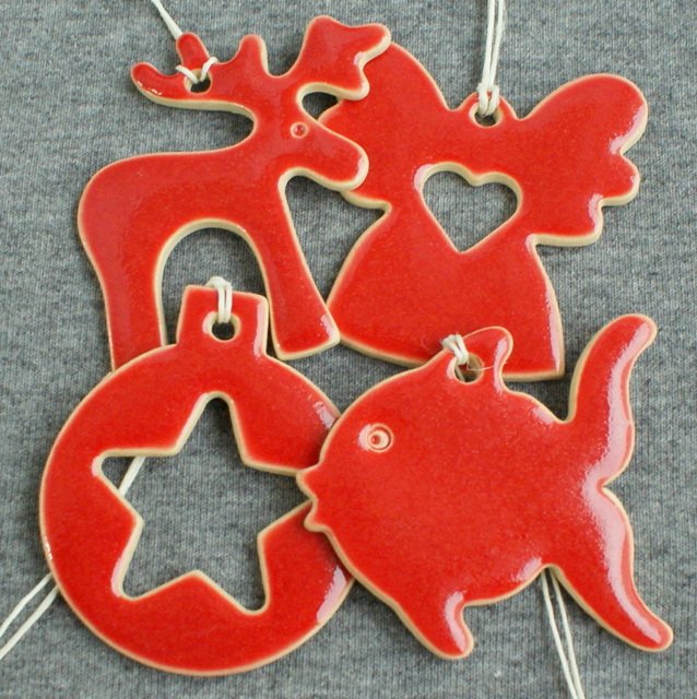 Ozdoby wykonane z białej gliny, pokryte przepięknym błyszczącym szkliwem w kolorze czerwonym.