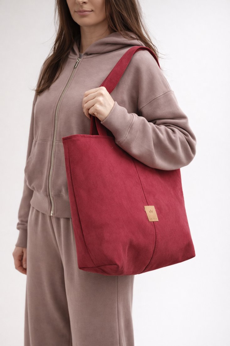 Starannie uszyta z grubego zamszu tapicerskiego w kolorze zgaszonej czerwieni.