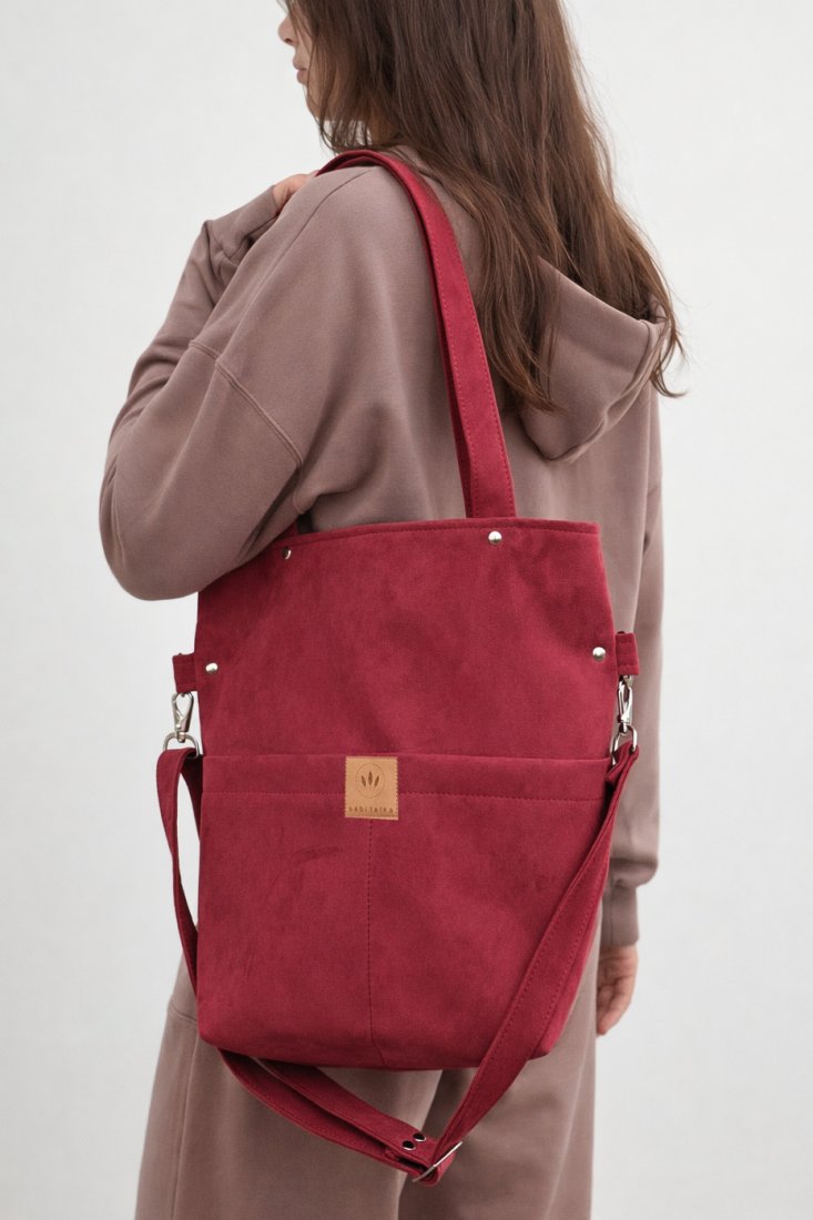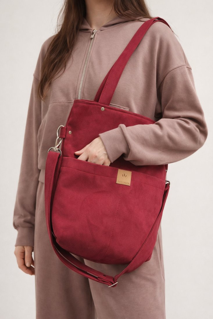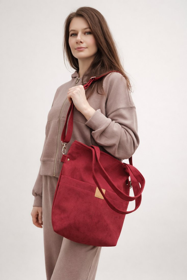 Prostokątna torebka z kieszeniami na froncie z wodoodpornego zamszu w kolorze zgaszonej czerwieni.