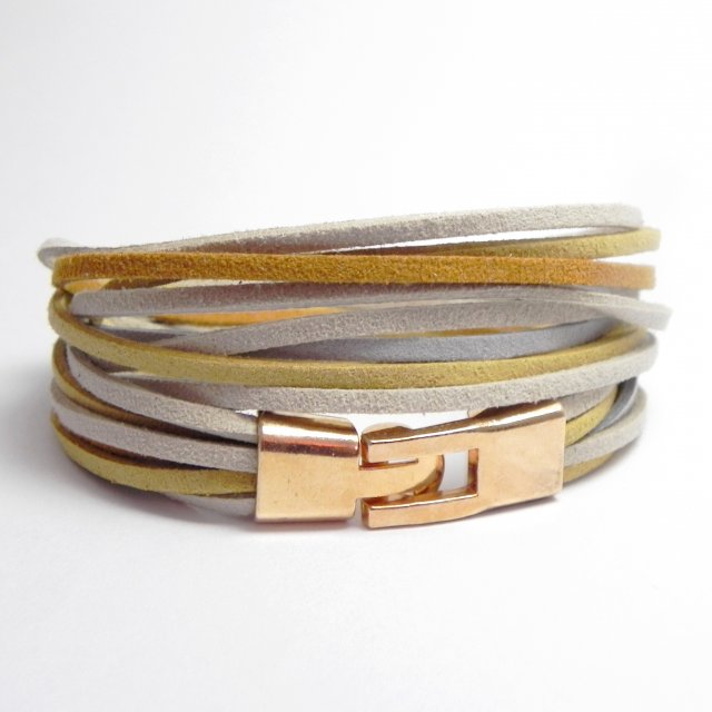 Efektowna bransoletka do dwukrotnego owinięcia wokół nadgarstka, wykonana została z miękkich rzemieni z zamszu ekologicznego oraz metalowego antyalergicznego zapięcia w kolorze złotym. Będzie odpowiednia na nadgarstek 18 cm, model dość ścisło przylegający.