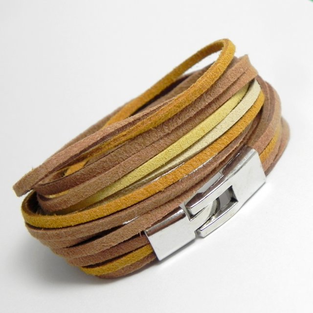 Efektowna bransoletka do dwukrotnego owinięcia wokół nadgarstka, wykonana została z miękkich rzemieni z zamszu ekologicznego (impregnowane preparatem chroniącym przed zabrudzeniem) oraz metalowego antyalergicznego zapięcia w kolorze srebra. Będzie odpowiednia na nadgarstek 16 cm, model dość ścisło przylegający.