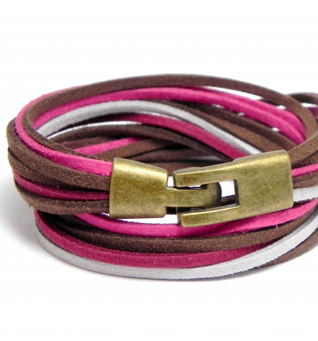 Efektowna bransoletka do dwukrotnego owinięcia wokół nadgarstka, wykonana została z miękkich rzemieni z zamszu ekologicznego oraz metalowego antyalergicznego zapięcia w kolorze antycznym. Będzie odpowiednia na nadgarstek 17 cm, model dość ścisło przylegający.