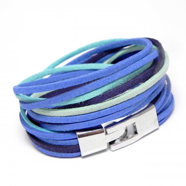 Świetna, modna bransoletka do dwukrotnego owinięcia wokół nadgarstka, wykonana została z miękkich rzemieni z zamszu ekologicznego ( impregnowane) oraz metalowego antyalergicznego zapięcia w kolorze srebrnym. Będzie odpowiednia na nadgarstek 16 cm, model dość ścisło przylegający..