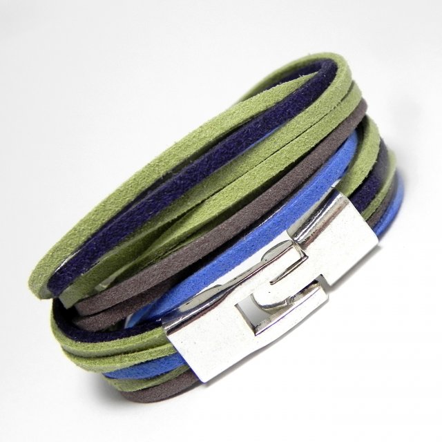 Efektowna, znana i lubiana bransoletka z serii 'zamszowe' do dwukrotnego owinięcia wokół nadgarstka, wykonana została z miękkich rzemieni z zamszu ekologicznego (impregnowane preparatem chroniącym przed zabrudzeniem) oraz metalowego antyalergicznego zapięcia w kolorze srebra. Bransoletka będzie odpowiednia na nadgarstek 15,5 cm, model ten jest dość ścisło przylegający.