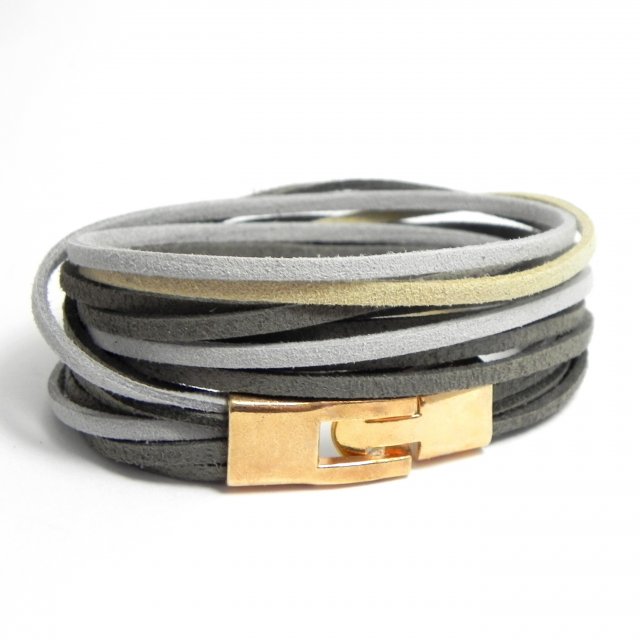 Efektowna bransoletka do dwukrotnego owinięcia wokół nadgarstka, wykonana została z miękkich rzemieni z zamszu ekologicznego oraz metalowego antyalergicznego zapięcia w kolorze złotym. Będzie odpowiednia na nadgarstek 17 cm, model dość ścisło przylegający.