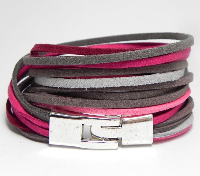 Efektowna, znana i lubiana bransoletka z serii 'zamszowe' do dwukrotnego owinięcia wokół nadgarstka, wykonana została z miękkich rzemieni z zamszu ekologicznego (impregnowane preparatem chroniącym przed zabrudzeniem) oraz metalowego antyalergicznego zapięcia w kolorze srebra. Bransoletka będzie odpowiednia na nadgarstek 15 cm, model ten jest dość ścisło przylegający.