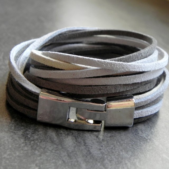 zamówiona* Świetna, modna bransoletka do dwukrotnego owinięcia wokół nadgarstka, wykonana została z miękkich rzemieni z zamszu ekologicznego ( impregnowane) oraz metalowego antyalergicznego zapięcia w kolorze srebrnym.