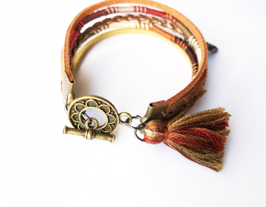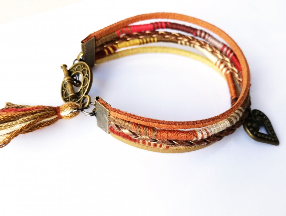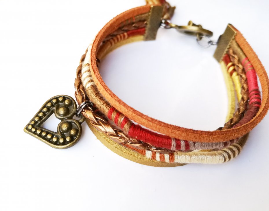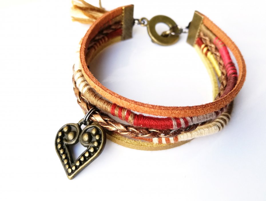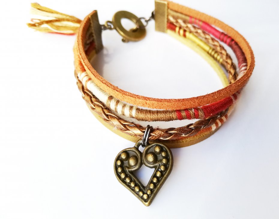 Boho bransoletka z zawieszkami - serce z piernika i chwost. Niepospolite odcienie kolorów brązu i mosiądzu.
