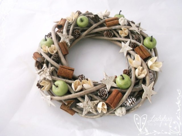 Piękny wianek świąteczny na szarobeżowej wiklinowej bazie z dodatkiem cynamonu i gwiazdek z kory brzozy, ożywiony zielonymi jabłuszkami. Urzeka prostotą i ponadczasowym wyglądem.