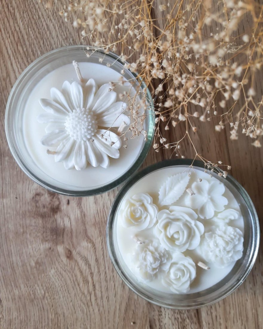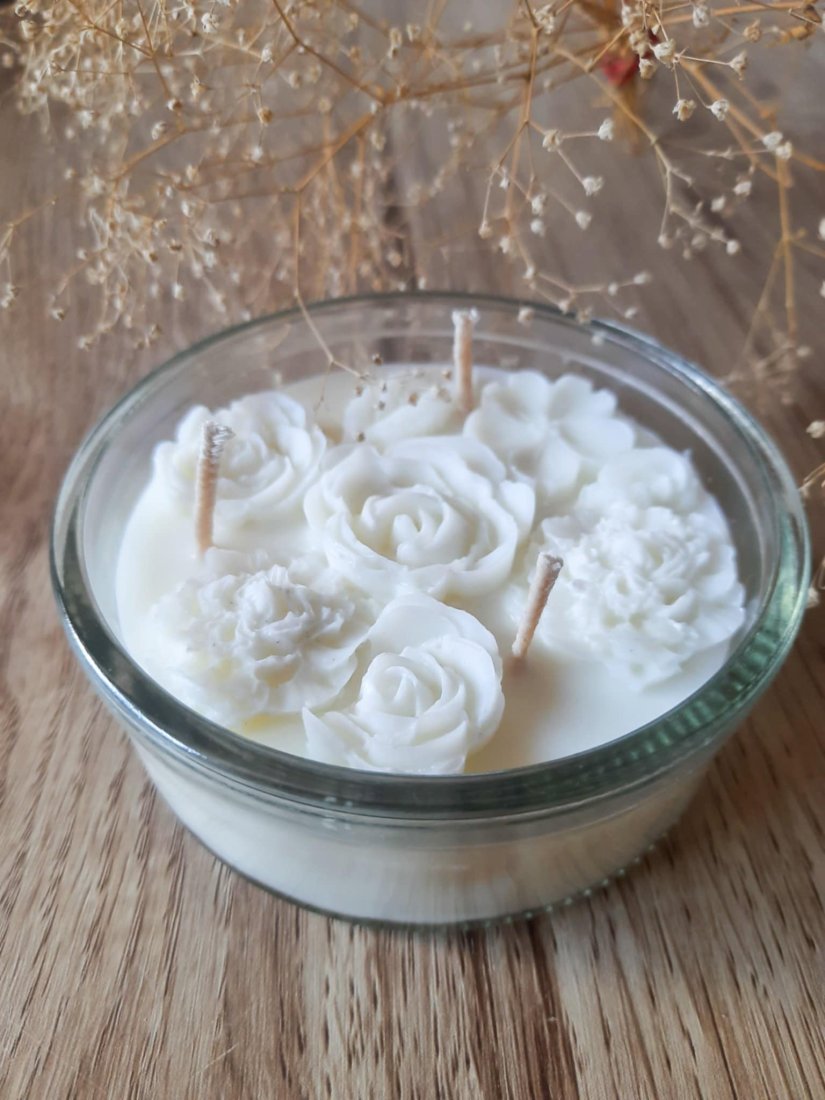 Naturalna, sojowa świeca w kremowym kolorze z woskowymi kwiatami. Piękny zapach róży i jaśminu.