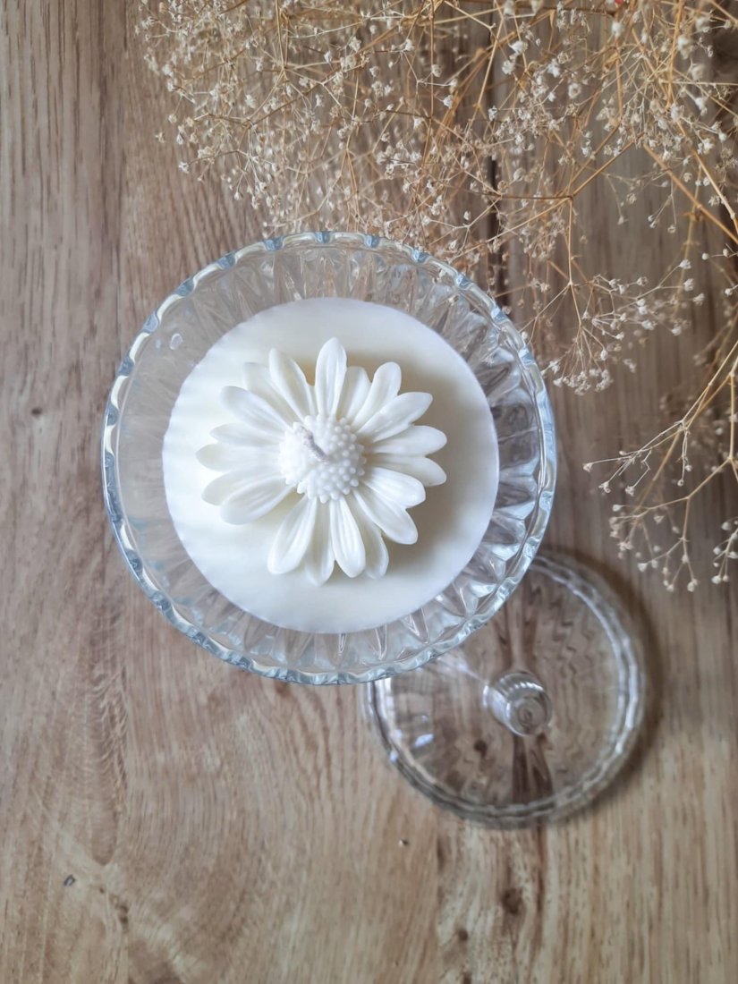 Naturalna, sojowa świeca w kremowym kolorze z woskowymi kwiatami. Piękny zapach róży i jaśminu.
