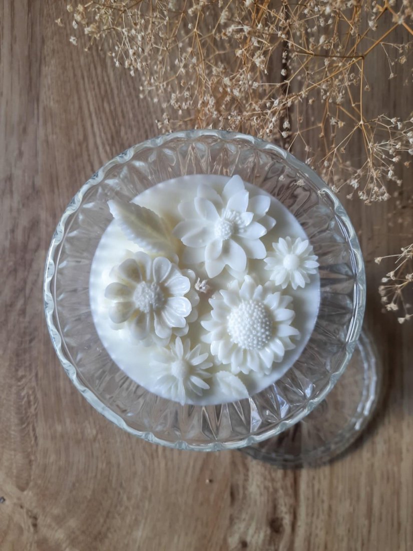 Naturalna, sojowa świeca w kremowym kolorze z woskowymi kwiatami. Piękny zapach róży i jaśminu.