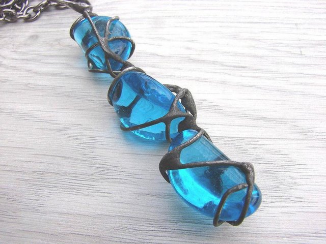 Antyczny wisior wykonany z cynowanej miedzi ozdabiany turkusowymi szklanymi kaboszonami lutowany stopem cyny i srebra. Całość patynowana na kolor starego srebra ręcznie przecierana i polerowana , zawieszona na 60 cm łańcuszku. Jeśli życzą sobie Państwo inną dowolną długość łańcuszka proszę o informacje mailową po zakupie a bez problemu to zmienię. Wymiary wisiora to ok.10 x 2 cm. Zapraszam do zakupu ...