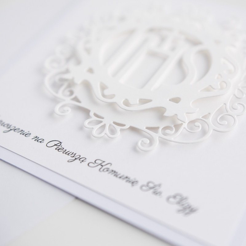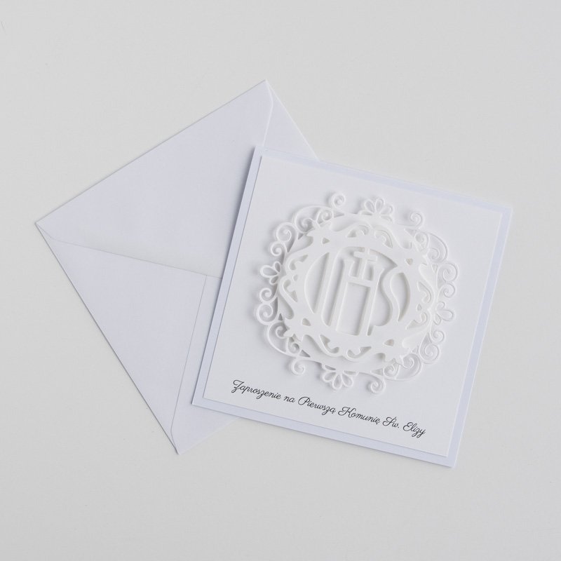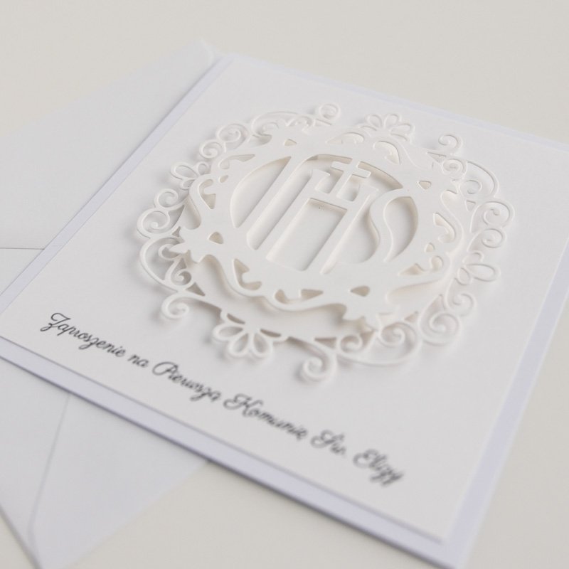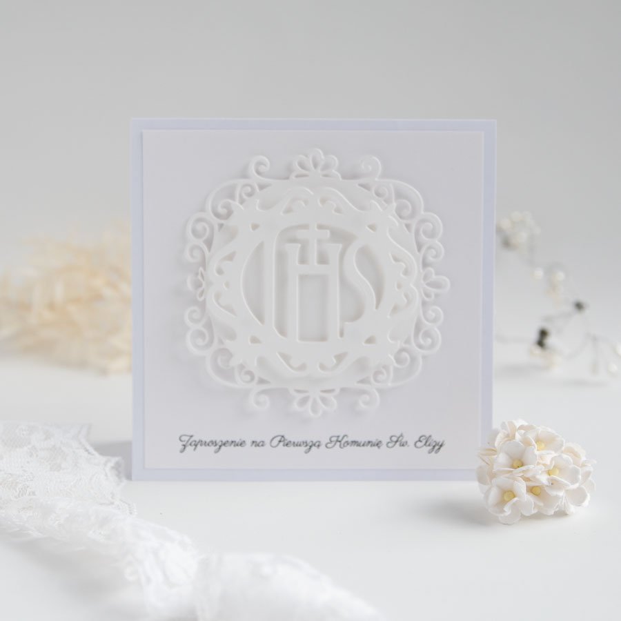 Zaproszenie o wymiarach 13,5x13,5cm, zdobione na froncie delikatnymi białymi ornamentami oraz napisem IHS.