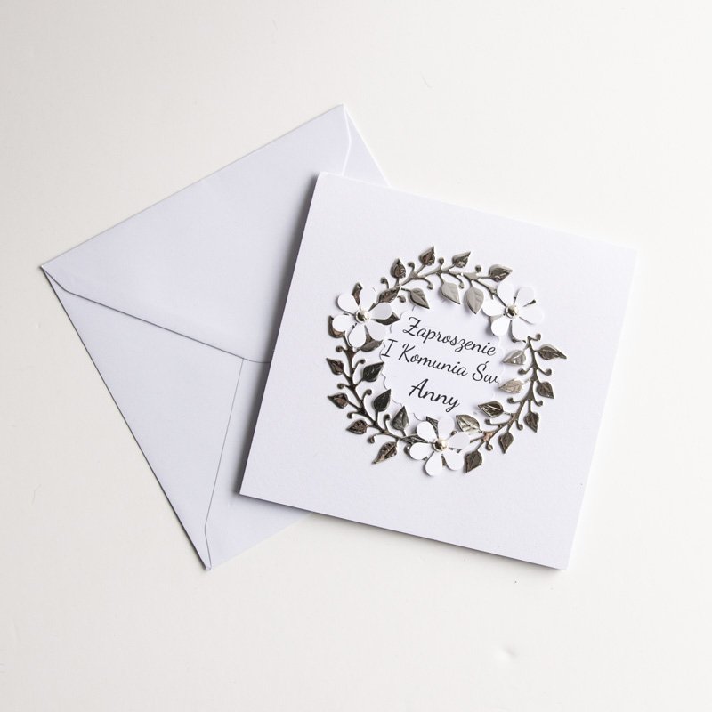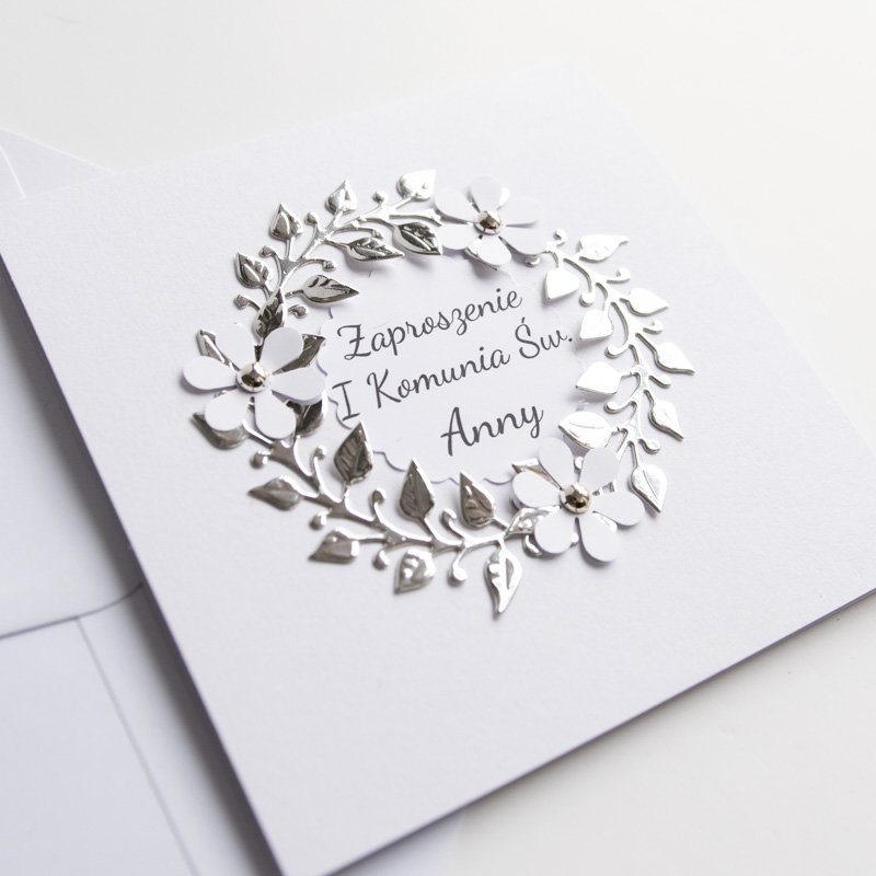 Zaproszenie o wymiarach 13,5x13,5cm, zdobione na froncie srebrnym wianuszkiem.