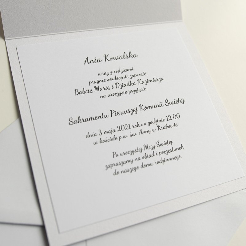Minimalistyczny styl oraz delikatny blask zaproszeń idealnie podkreśli charakter uroczystości, jaką jest Pierwsza Komunia Święta dziecka.
