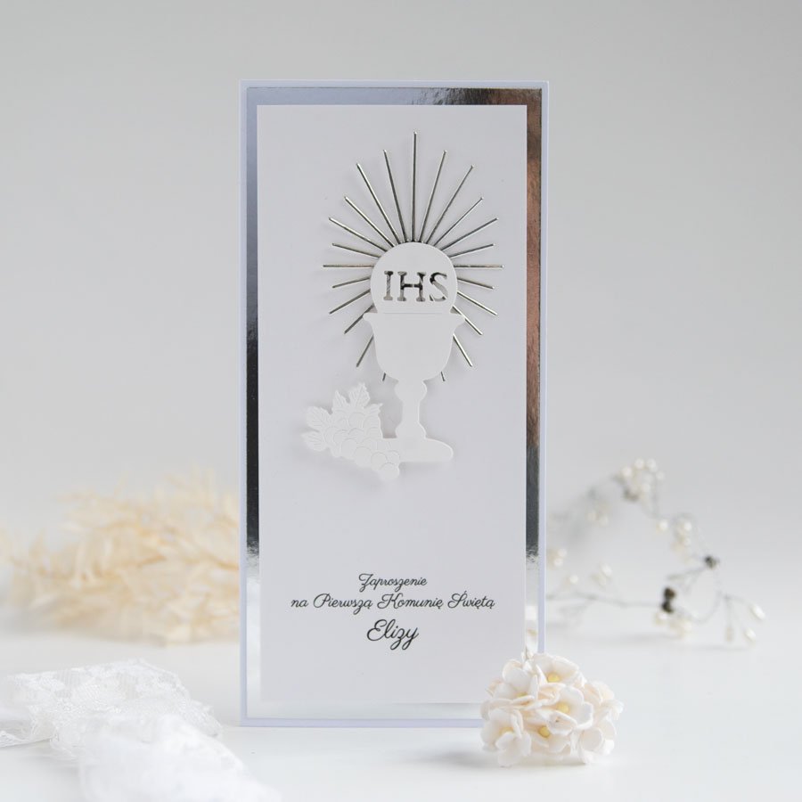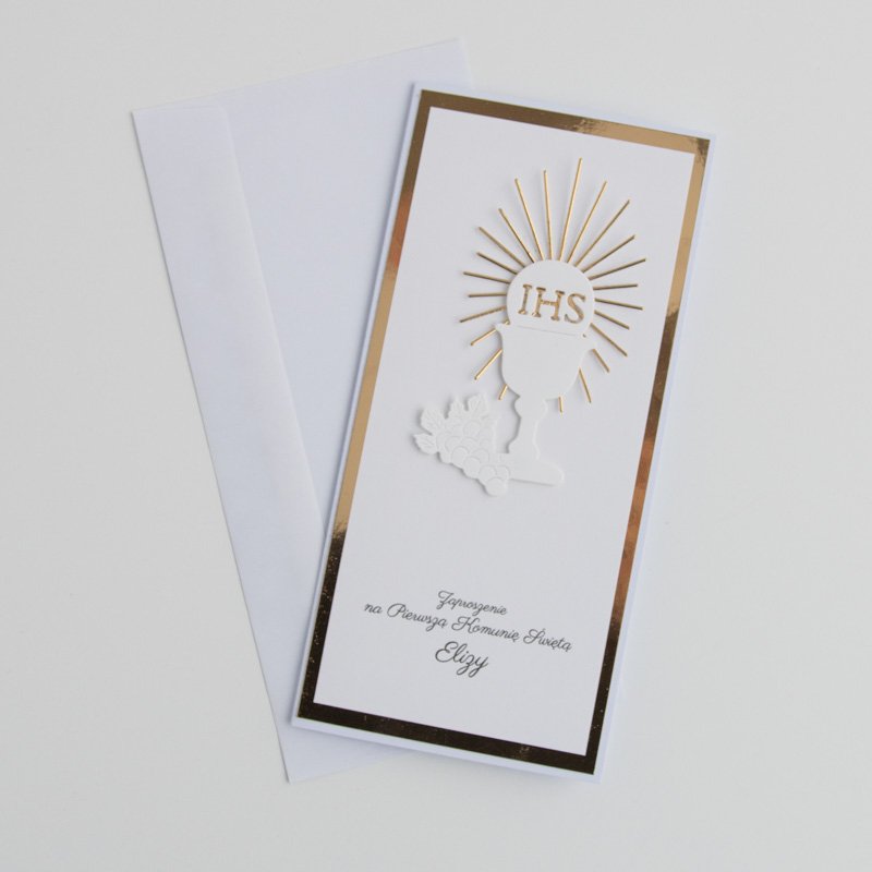 zaproszenie na Pierwszą Komunię Świętą o wymiarach ok 10,5x21cm, zdobione motywem kielicha z hostią. Całość dopełnia złota rameczka.