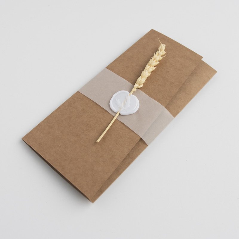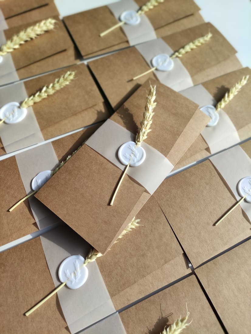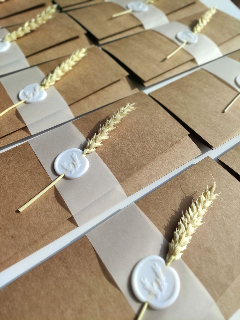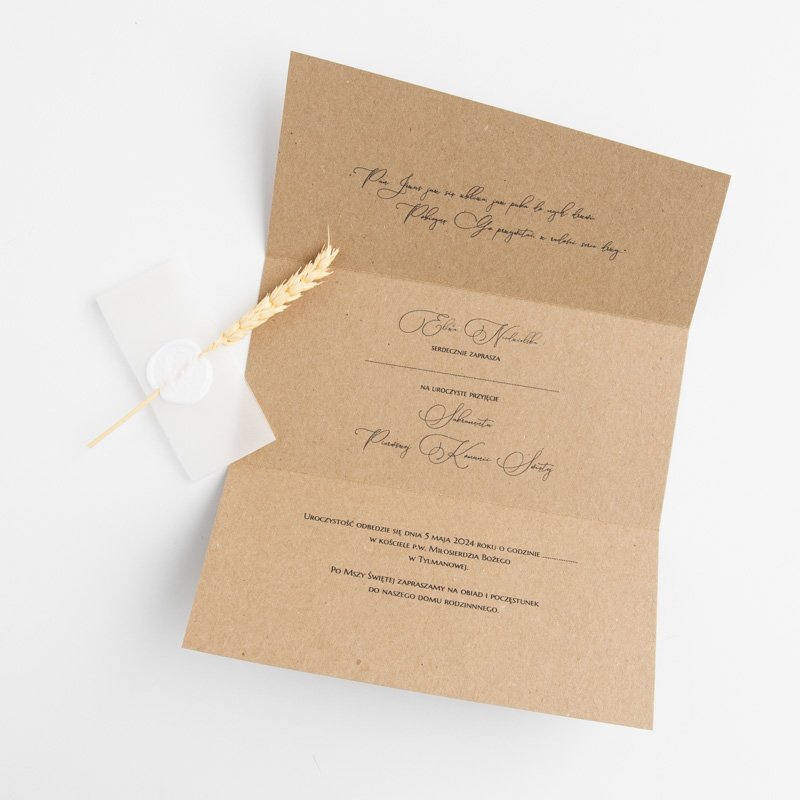 Zaproszenia wykonane są na bazie brązowego papieru ekologicznego, po rozłożeniu mają format a4. Złożone zaproszenia spięte są półprzezroczystą opaską z pieczęcią oraz kłosem zboża.