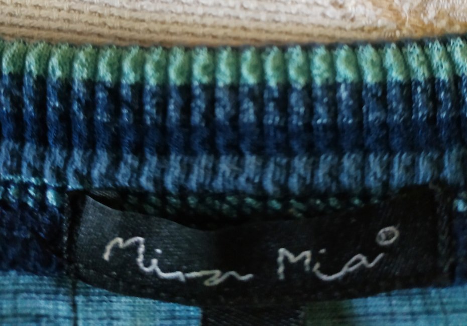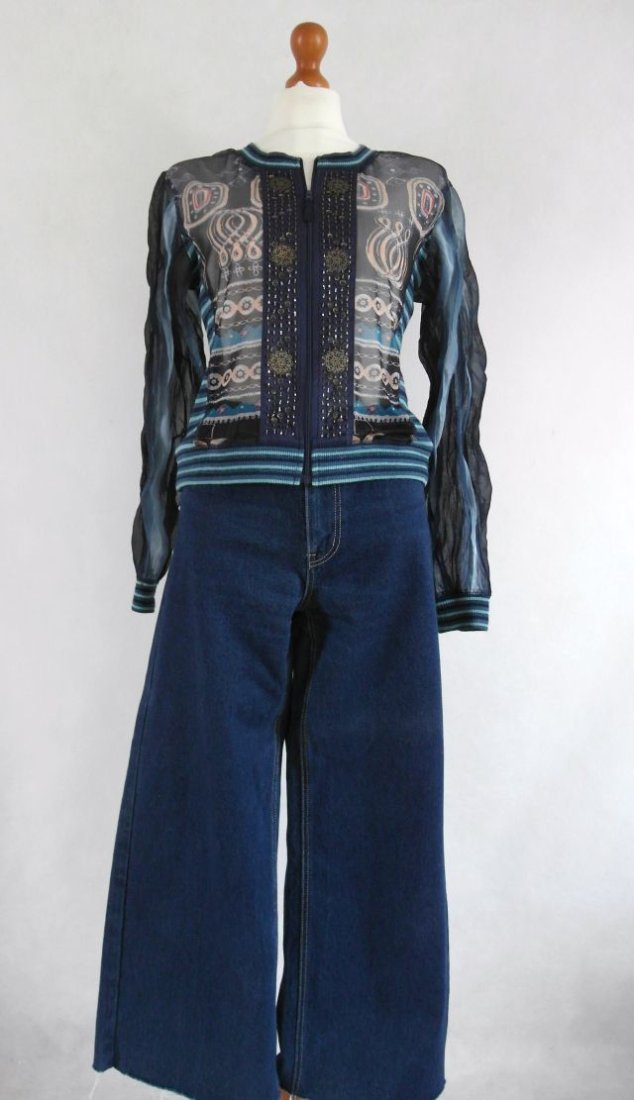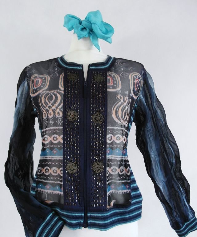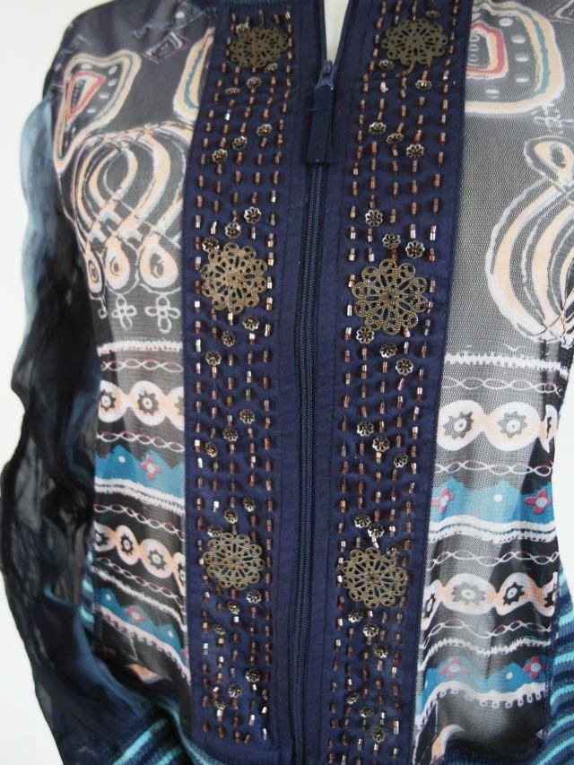 trudno mi rozczytać markę, ale jest zdjęcie :-) bluzka jest na suwak, ozdobiona metalowymi delikatnymi rozetkami w kolorze starego złota oraz drobnymi brązowymi koralikami. Rękawy z cieniowanego tiulu w ściągaczowy mankiet.Kolory - granatowy, turkusowy i beż. Delikatnie prześwituje, plecy z dzianiny.