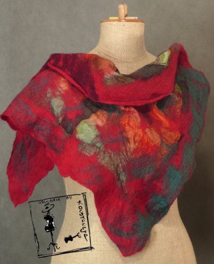 Wykonany ręcznie metodą filcowania na mokro wysokogatunkową wełną z australijskich merynosów (miękką i delikatną w dotyku) na naturalnym, ręcznie malowanym przez autora jedwabiu .