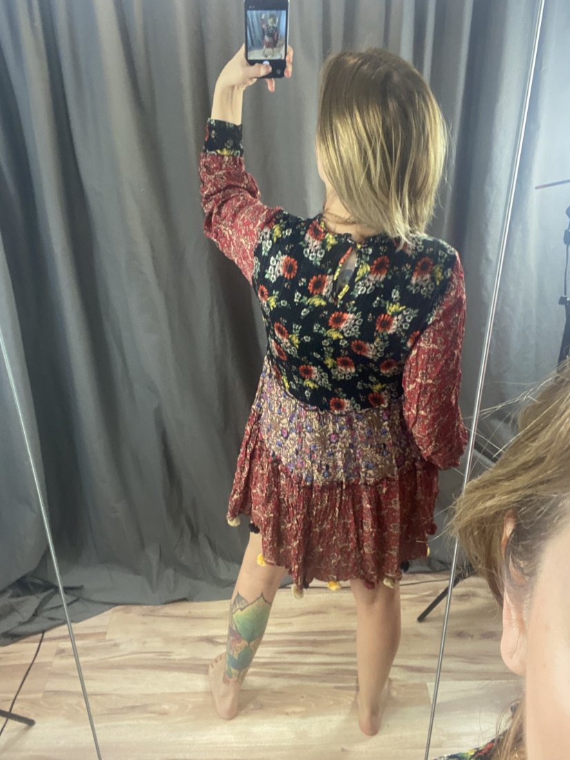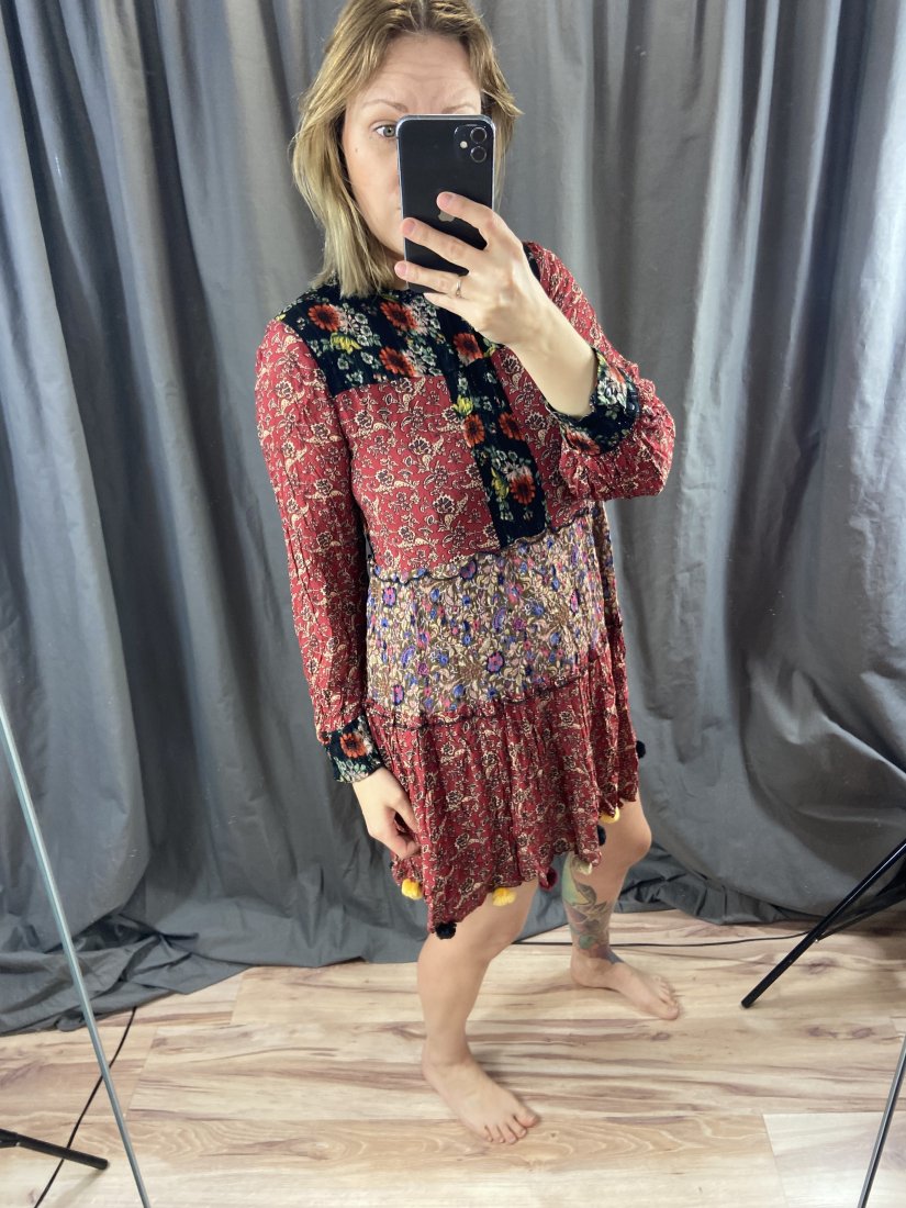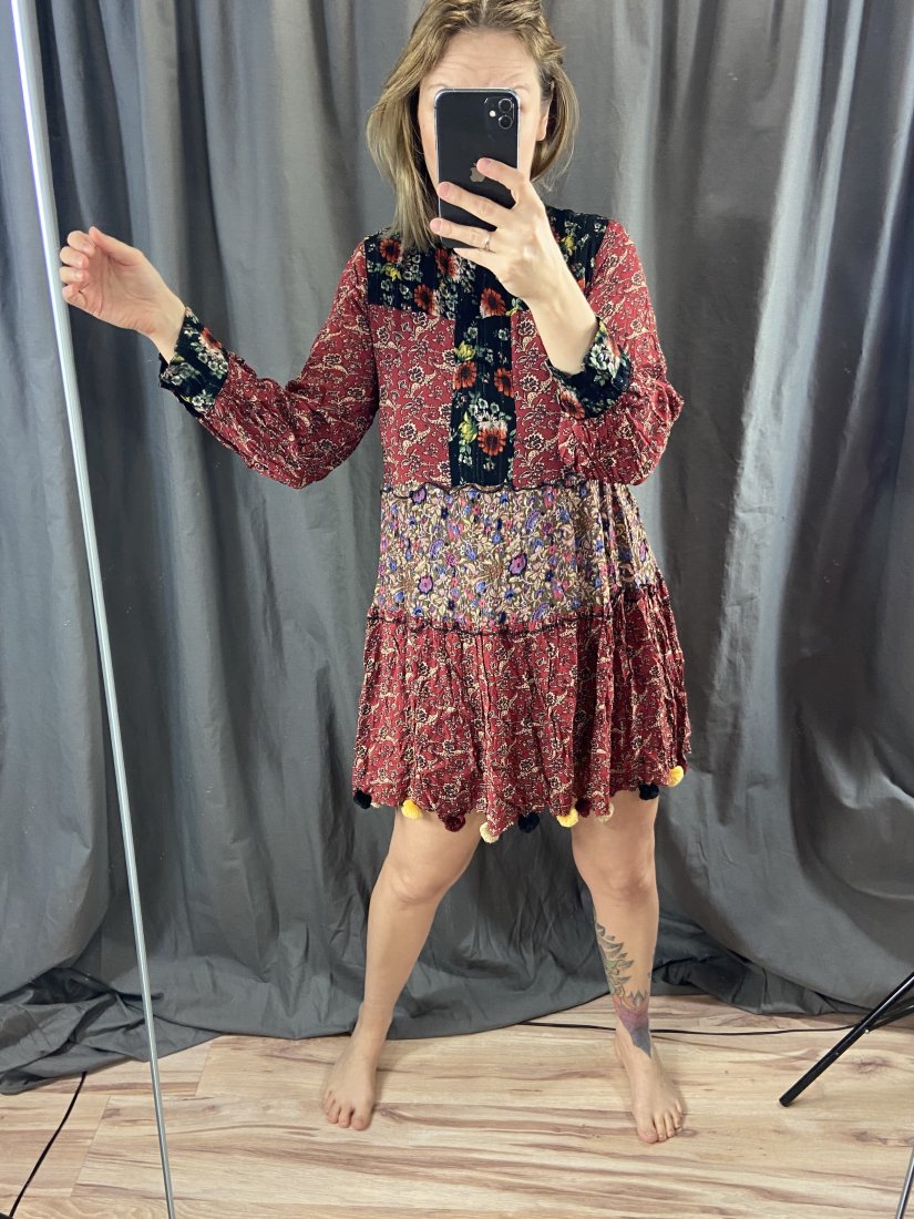 Etno sukienka z zary. Z pomponikami. Z wiskozy, w linni ciała cieniutka podszewka z poli.
