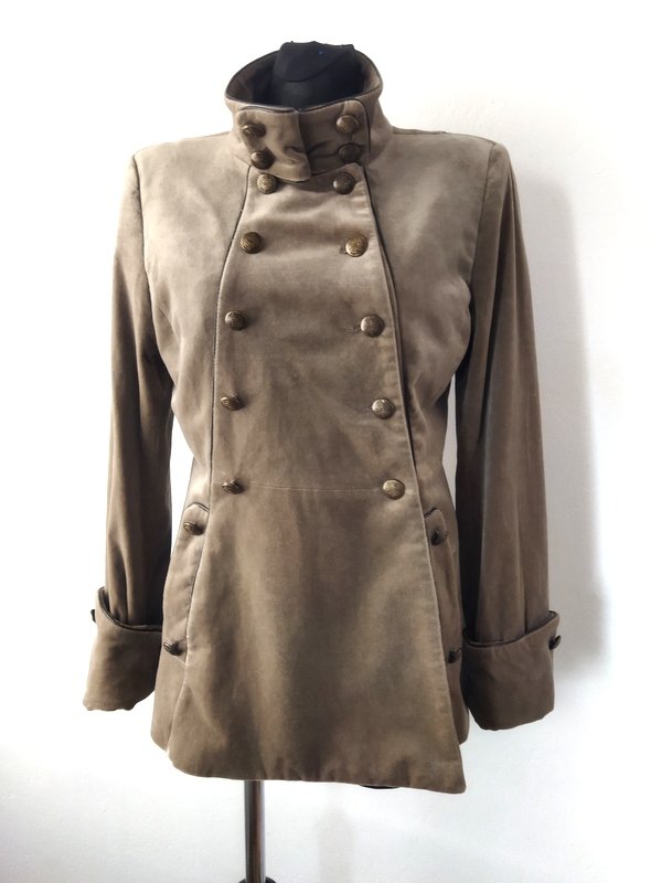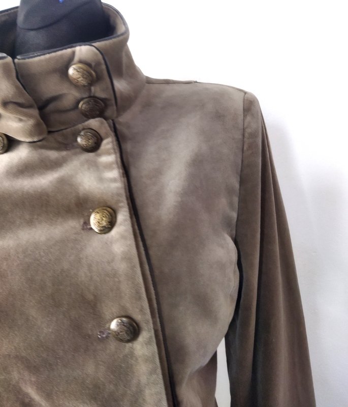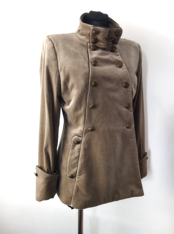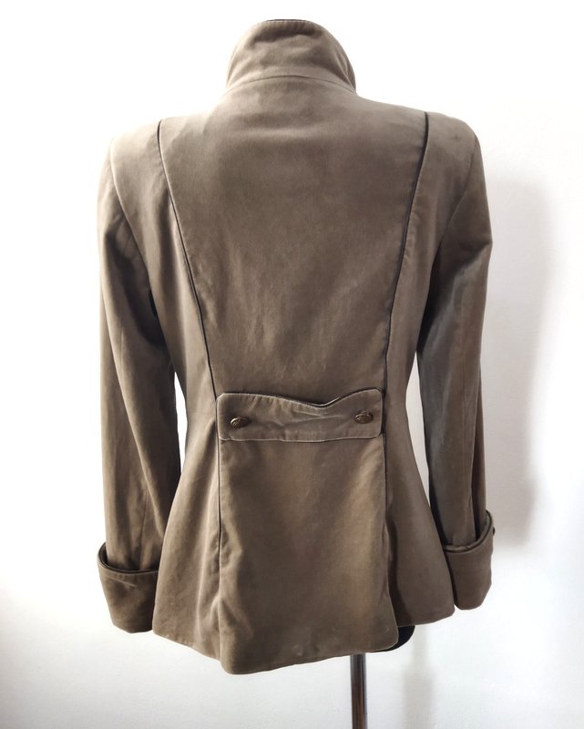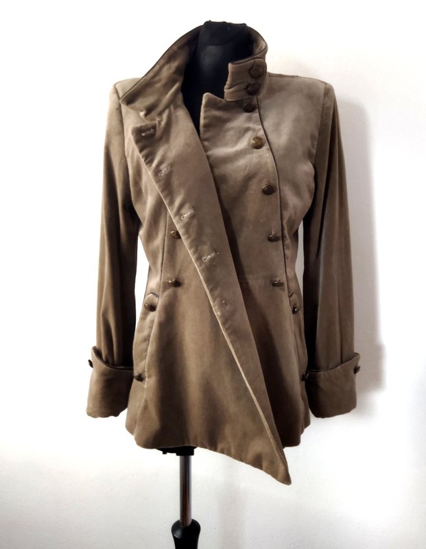 Świetna kurtka lub dłuższa marynarka w militarnym stylu z aksamitnej tkaniny w mysim kolorze, z czarnymi wąskimi lamówkami przy każdym szwie. starannie uszyta z licznymi detalami i licznymi . Taliowana , odcinana w pasie z kołnierzem stójką, z dwiema wpuszczanymi kieszeniami, z wyższymi odwijanymi mankietami, z patką z tyłu. Zapinana i zdobiona metalowymi grawerowane guziki. Całość na wiskozowej podszewce.