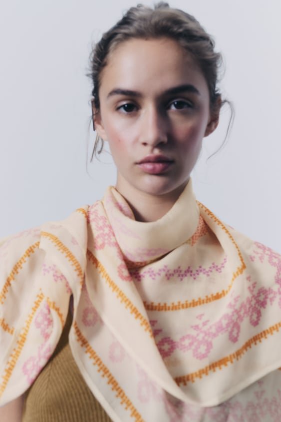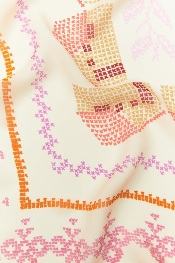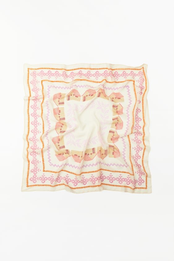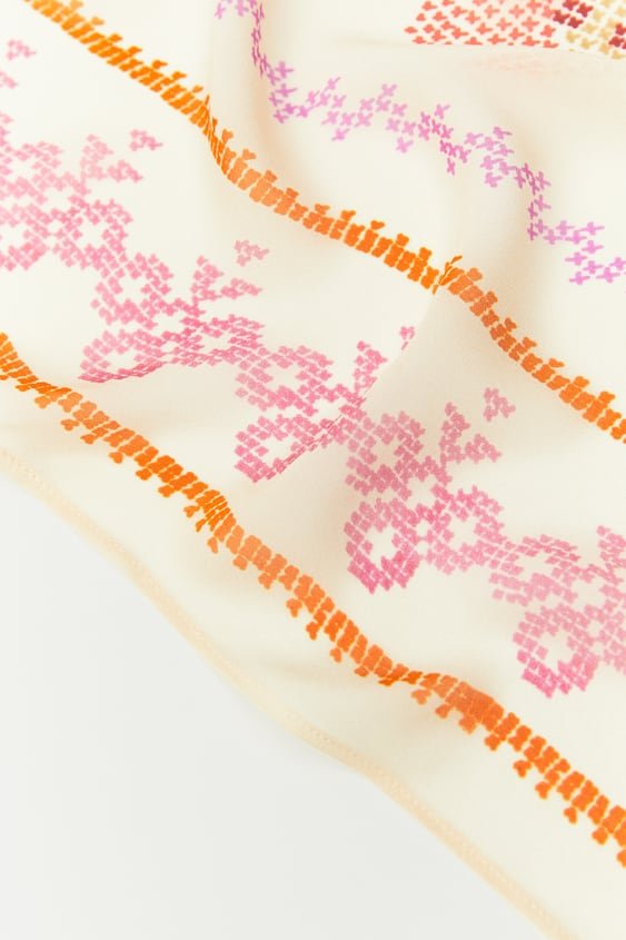 Apaszka ze 100% tkaniny wiskozowej. Nadruk imitujący haft krzyżykowy.